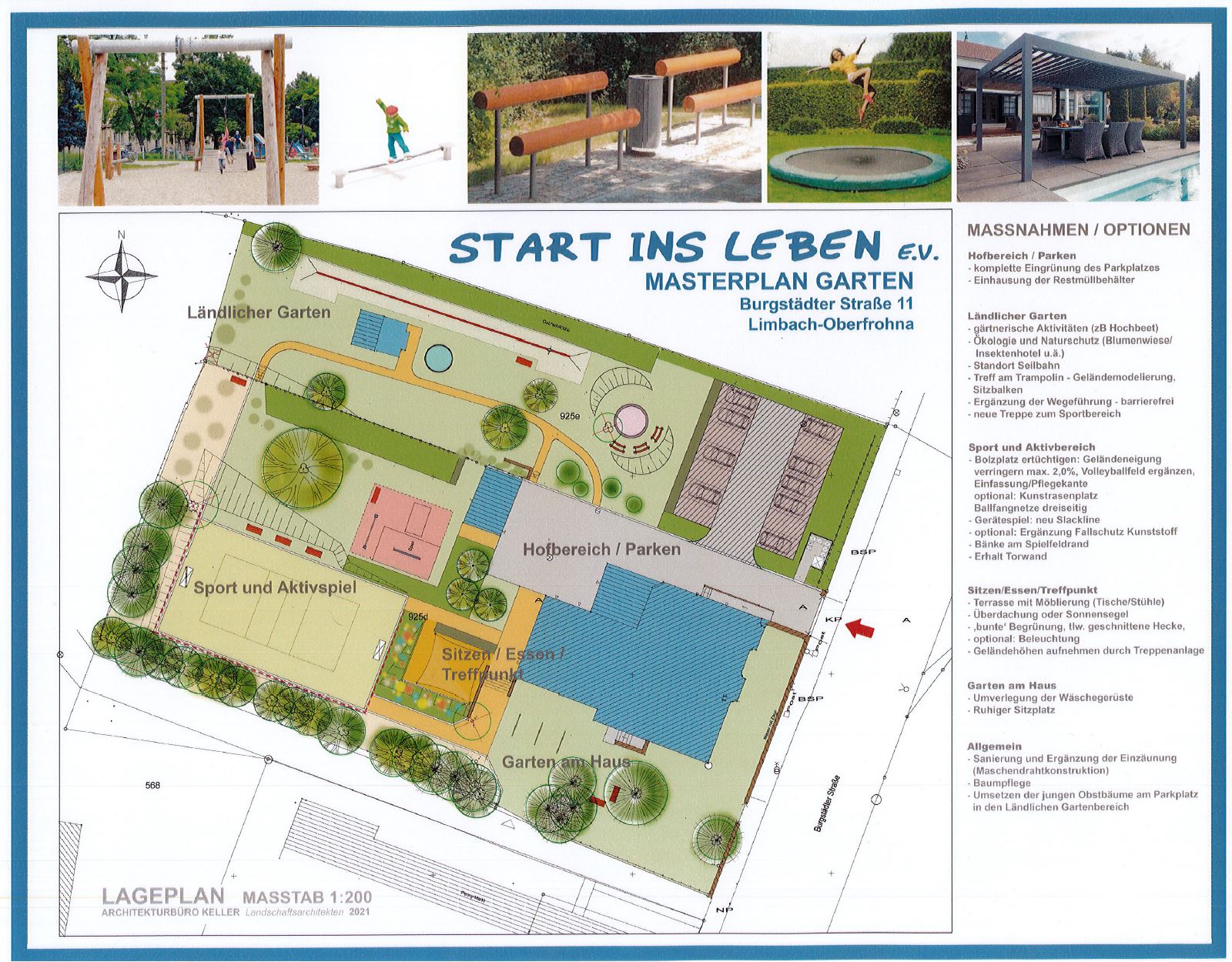 Bis zum nächsten Jubiläum 2022 „75 Jahre Kinderheim in Limbach-Oberfrohna“ möchten wir mindestens einen neuen Bereich gestalten. Dafür setzen wir eigene Mittel ein, wollen Spender gewinnen und Fördermittel generieren. Der Masterplan ist für uns der rote Faden um die Außenanlagen Schritt für Schritt in den nächsten 3-5 Jahren final umzubauen. Natürlich werden die Kinder und Mitarbeiter mit einbezogen.